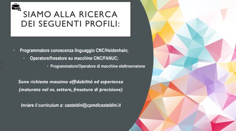 Siamo alla ricerca dei seguenti profili: – Programmatore conoscenza linguaggio CNC/HEIDENHAIN – Operatore/fresatore su macchine CNC/FANUC – Programmatore/Operatore di macchine […]